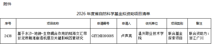 在2026年度浙江省自然科学基金申报工作中,我院科研团队积极攻关、精准发力,共有2项申报项目成功入围会议评审阶段,展现出扎实的研究基础与强劲的竞争实力。其中,由我院卢声亮老师担任项目负责人的“基于水沙-地貌-生物耦合作用的陆海交汇带淤泥质潮滩崩塌机理及关键影响因素研究”项目,成功入选浙江省自然科学基金拟资助项目名单。